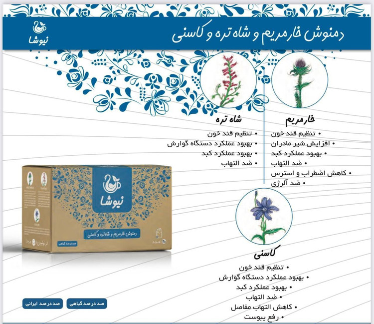 - دمنوش خارمریم با ترکیب شاهتره و کاسنی به درمان اختلالات صفراوی ودرمان مشکلات گوارشی و همچنین درمان بیماری های پوستی وکنترل قند خون باکمک به سلامت قلب میباشد مشاوره درمان رایگان با یک عکس از زبان